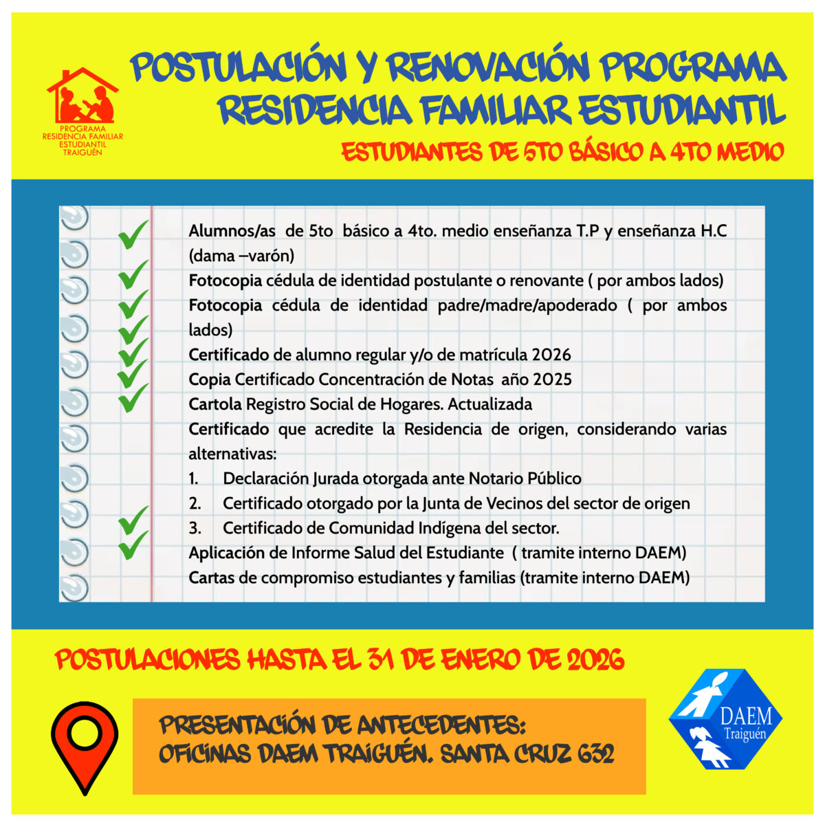 El Departamento de Educación informa a la comunidad que ya se encuentran abiertas las postulaciones al Programa de Residencia Familiar Estudiantil (RFE), iniciativa del Ministerio de Educación dirigida a estudiantes que viven en sectores rurales, aislados o de difícil acceso, y que requieren trasladarse para continuar sus estudios. Las inscripciones estarán disponibles hasta el 31 de enero.